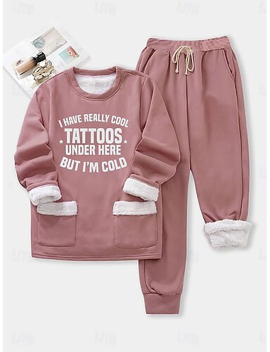 Dámské Dvoudílné sady Tepláková souprava Sady kalhot Dlouhý rukáv Biskup Tričkový Kulatý Grafika Písmeno Tisk Elegantní Teplé Módní Denní Venkovní Dovolená Vodní modrá Černá Světlá růžová Jaro Běžný