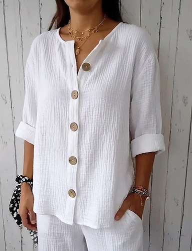 Dámské Halenka Imitace bavlny a lnu Knoflíky Pevná barva stylové Základní Na běžné nošení Dlouhý rukáv Košilový límec Dlouhé topy Denní Vodní modrá Bílá Světlá růžová Trávová zelená Meruňková Léto