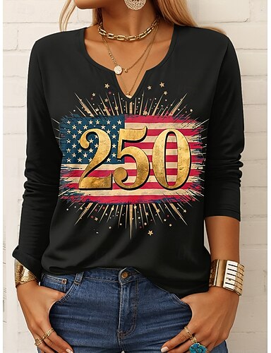 Den nezávislosti Americký výroční Patriotic Dámské tričko Grafický Vlajka Vintage Stylové Moderní Dlouhý rukáv Vytvořený výstřih Denní víkend Tisk Modrá Černá Khaki Jaro Zima