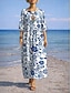 Dámské maxi šaty modré a bílé květinové šaty na dovolenou s potiskem, prázdninové ležérní plážové plážové šaty na výlety, květinový vzor, 3/4 rukáv, kulatý výstřih, modrá červená, fialová, zelená
