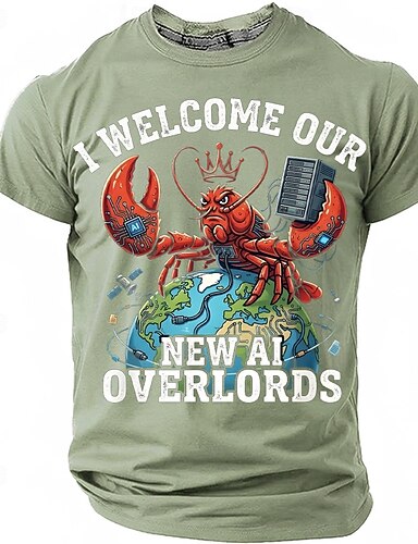 Pánské tričko s otevřenými drápy, humry, králem, vítám naše nové AI Overlords, zeměkoule, AI agent, tech, geeky programátor, s potiskem, regular střih, ležérní, denní nošení, značkové oblečení,