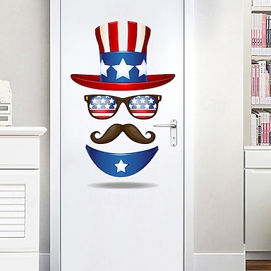 Balení 2 ks vlasteneckých samolepek na dveře ke Dni nezávislosti 4. července, samolepky na zeď s kloboukem strýčka Sama, slunečními brýlemi a knírem, červeno-bíle-modré samolepicí dekorace na sloupání