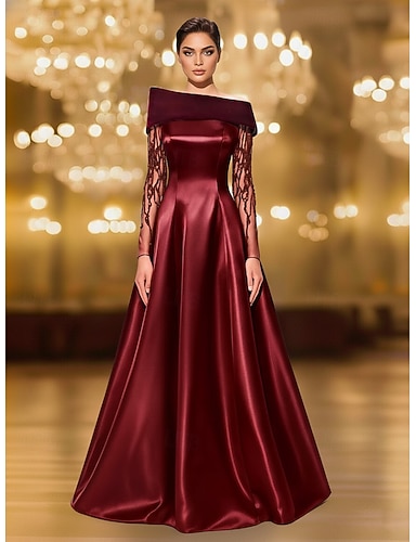A-Linie Na zem Večerní šaty Plesové Formální šaty Elegantní Třpytivé Hedvábný povrch Dlouhý rukáv Pod rameny Formální Svatební Kapsy Elastický satén Samet s Korálky