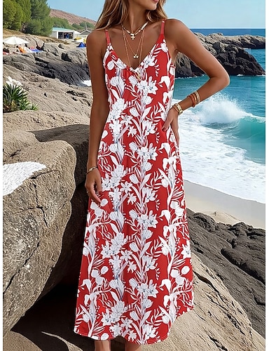 Dámské Midi šaty Květinové šaty Slip Dress Šaty s potiskem Klasické Moderní Venkovní Dovolená Běžný Květiny Bez rukávů Špagetová ramínka Rubínově červená Léto