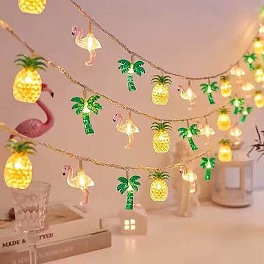 Tropické LED řetězové osvětlení s motivem ananasu, plameňáků, palm, AA bateriové světýlka pro dekoraci místnosti, vícebarevné slavnostní osvětlení, ideální tematické osvětlení atmosféry, dekorativní