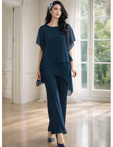Kalhoty 3 kusový oblek Na zem Po kotníky Šaty pro matku nevěsty Poloviční rukáv Tričkový Elegantní Jednoduchý Minimalistické Svatební host Šifón s Křišťály Kaskádové řasení