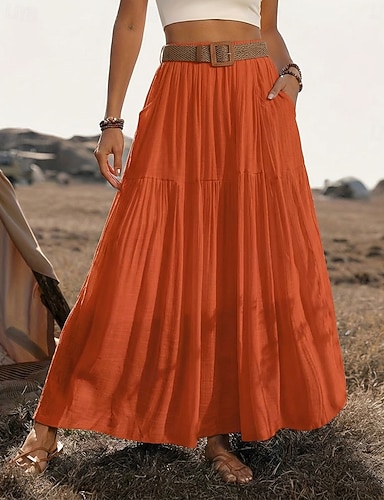 Dámské Asijská velikost Dovolená sukně Na běžné nošení léto Maxi Vysoký pas Sukně Jednobarevné Nabírané šaty Plisé Kapsy Neelastické Denní Dovolená Jablkově zelená Rubínově červená Královská mod