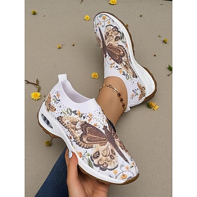 Dámské růžové tenisky s motýlím květinovým potiskem, prodyšné pletené nazouvací boty na platformě, pohodlné boty na každodenní nošení & &celodenní nošení
