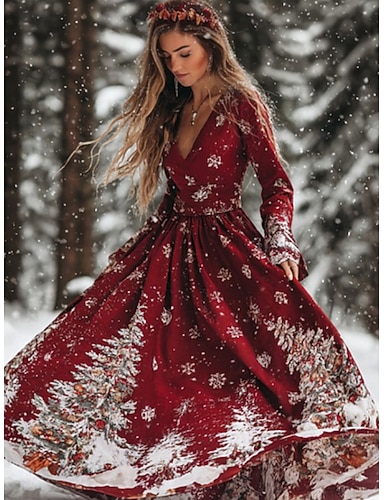 Vánoce Dámské Maxi šaty Plisované šaty Večírek Na běžné nošení Cikánský Denní Rande Jdeme ven Běžný Vánoční stromek Dlouhý rukáv Do V Černá Rubínově červená Podzim Zima