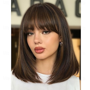 Melírované vrstvené paruky s ofinou 35 cm krátké, smíšené hnědé, bezlepkové, rovné, připravené k nošení, syntetické bob paruky pro ženy s realistickou pokožkou hlavy, pro každodenní cosplay použití