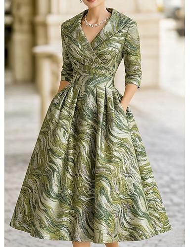 A-Line Tea Length Party Dress Cocktail Dress Wedding Guest Dress Evening Gown Elegant Vintage 3/4 Length Sleeve Shirt Collar Wedding Formal Jacquard with Pocket