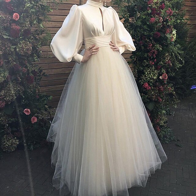 Style:Formal,Simple,Bishop sleeves,Trends:1950s,Silhouette:A-Line,Hemline / Train:Floor Length,Neckline:High Neck,Fabric:Lace,Satin,Tulle,Closure:Zipper UP,Sleeve Length:Long Sleeve,Waistline:Natural,Fully Lined:Yes,Embellishment:Ruched,Wedding Events:Garden / Outdoor,Hall,Tips:Professional dry cleaner only,Colors may vary slightly due to different monitor settings,Theme:Vintage,Simple,Jacket & Wrap:No,