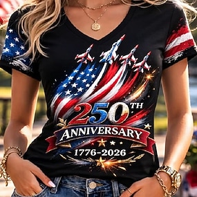Unabhängigkeitstag Patriotisches Damen T-Shirt Grafik Buchstabe Vintage Stylisch Klassisch Kurzarm V-Ausschnitt Reguläre Oberteile Alltag Druck Blau Schwarz Weiß Rot Sommer Frühling