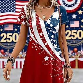Amerikanischer Unabhängigkeitstag Damen Knielanges Kleid A Linie Kleid Urlaub Lässig Strand Strand Normale Passform Grafik Flagge Kurzarm V Ausschnitt Blau Schwarz Weiß Rote Sommer Frühling