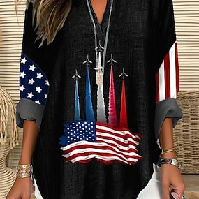 Amerikanischer Unabhängigkeitstag Damen T Shirt Druck Grafik Flagge Vintage Stilvoll Klassisch Kurzarm V Ausschnitt Lange Oberteile Täglich Schwarz Weiß Staubiges Blau Sommer Frühling