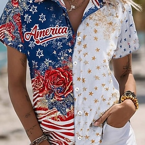 Amerikanischer Unabhängigkeitstag Damen Hemd Grafik Flagge Vintage Stilvoll Lässig Kurzarm Hemdkragen Normale Oberteile Täglich Leicht Blau Sommer Frühling