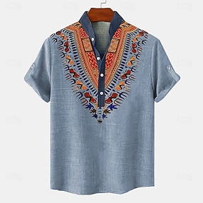 Herren leinenhemd Henley Shirt Retro-Shirts Vintage-Shirt Ethnisches Hemd Ethnisch Urlaub Täglich Blau Grün Khaki Kurzarm Mandarinkragen Sommer Frühling Bekleidung Bedruckt