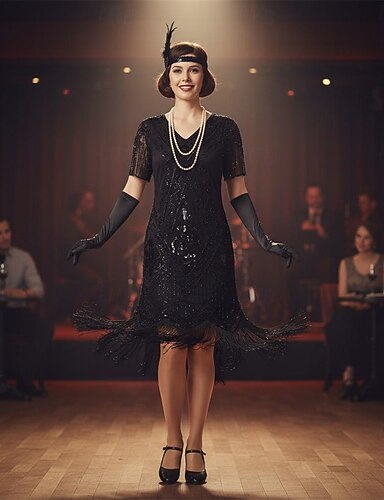 Goldene Zwanziger 1920er Knielang Kleid Flapper Kleid Outfits Ärmellos Der große Gatsby Charleston Übergrössen Quastenfransen Feder V Ausschnitt Kostüm Damen Karneval Neujahr Maskerade