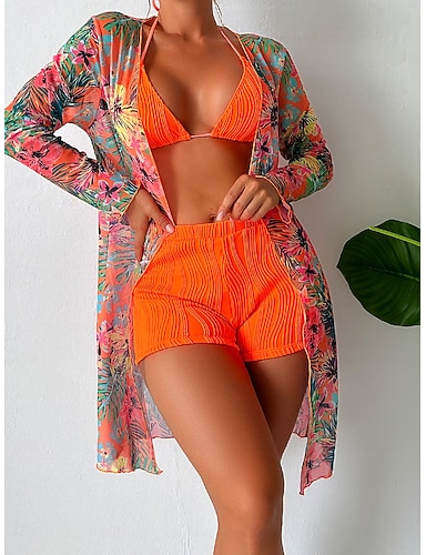 Damen Bikini 3-teilig Badeanzug Palm Shorts Bauchkontrolle Hohe Taille Slim Rückenfrei Urlaub Strandbekleidung Blumen Halterhals Ärmellose Bademode