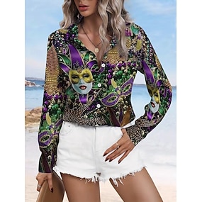 Karneval Damen Hemd Bluse Grafisch Geometrisch Vintage Stilvoll Lässig Langarm Hemdkragen Reguläre Oberteile Täglich Patchwork Knöpfe Druck Grün Sommer Frühling Herbst Winter