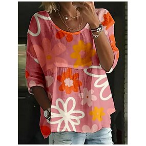 Damen Hemd Druck Blumen 3D Täglich Lässig Dreiviertelarm Rundhalsausschnitt Normale Oberteile Täglich Ferien Purpur Sommer Frühling Herbst