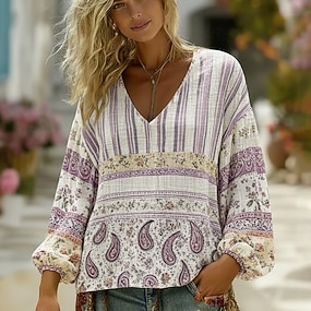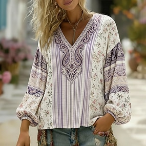 Damen Bluse Leinenähnlich Atmungsaktiv Leicht Tunika V-Ausschnitt Lange Ärmel Boho Lässig Oberteile Geometrisch Paisley Vintage Alltag Stylisch Eingekerbter Ausschnitt Alltag Resort Wear Druck Maroon