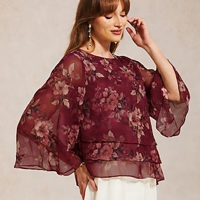 Damen Chiffon Tops Geschichtet Blumen Grafik Elegant Täglich Stilvoll Halbarm Glockenärmel Rundhalsausschnitt Normale Oberteile Täglich Arbeit Hochzeitsgast Marineblau Sommer Frühling Herbst