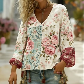 Damen Hemd Blumen Grafik Vintage Stilvoll Langarm V Ausschnitt Lange Oberteile Täglich Ferien Ausgehen Rosa Purpur Beige Sommer Frühling