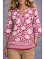 Boho Bluse Damen Floral Grafik Bohemia Vintage Tropisch 3/4-Länge Ärmel V-Ausschnitt Reguläre Oberteile Rot Sommer Frühling