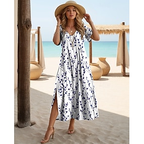 Damen Midikleid A Linie Kleid Sommerkleid Urlaub Lässig Strand Lässiger Schnitt Blumen Grafik Kurzarm V Ausschnitt Weiß Pfauenblau Sommer Frühling