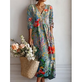 Maxikleid Damen Leinenartig Atmungsaktiv Leicht Sommerkleid Shift Kleid Freizeitparty Urlaub Reguläre Passform Floral Grafik Lange Ärmel V-Ausschnitt Blau Gelb Rot Orange Sommer Frühling