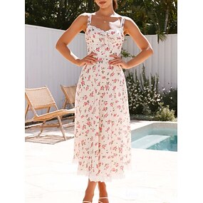 Damen Midikleid Sommerkleid A Linie Kleid Unterkleid Faltenkleid Urlaub Lässig Boho Strand Date Normale Passform Blumen Grafik Ärmellos U-Ausschnitt Rundausschnitt Rosa Rote Grün Beige Sommer Frühling
