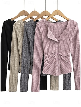 Damen Pullover Mode Einfarbig Gerippt V Ausschnitt Gestrickt Langarm Normale Oberteile Stricken Ferien Ausgehen Wochenende Grau Herbst