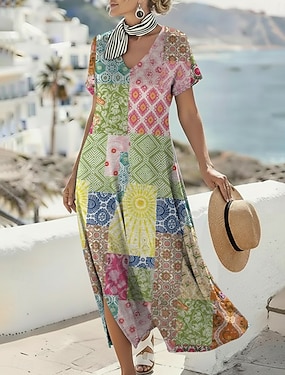 Damen Maxikleid Boho-Kleid Freizeitkleid A Linie Kleid Druckkleid Vintage Outdoor Urlaub Wochenende Lässiger Schnitt Grafik Kurzarm V Ausschnitt Schwarz Gelb Hellgrün Rosa Sommer Frühling