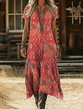Damen Midikleid Boho-Kleid Freizeitkleid A Linie Kleid Druckkleid Vintage Outdoor Urlaub Wochenende Normale Passform Blumen Grafik Abstrakt Kurzarm V Ausschnitt Rote Sommer Frühling