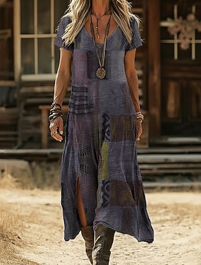 Damen Maxikleid Boho-Kleid Freizeitkleid A Linie Kleid Druckkleid Vintage Outdoor Urlaub Wochenende Normale Passform Blumen Grafik Kurzarm V Ausschnitt Blau Dunkelgrün Violett Grün Sommer Frühling