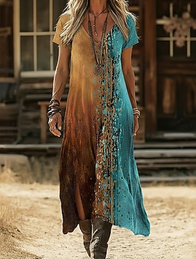 Damen Maxikleid Boho-Kleid Freizeitkleid Unterkleid Elegant Mode Modern Outdoor Urlaub Ausgehen Normale Passform Grafik Kurzarm Rundhalsausschnitt Blau Gelb Wein Pfauenblau Sommer Frühling