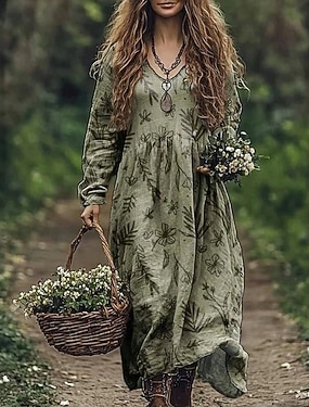 Damen Maxikleid Boho-Kleid Vintage-Kleid Freizeitkleid Vintage Täglich Outdoor Urlaub Normale Passform Blumen Langarm V Ausschnitt Grün Frühling Herbst