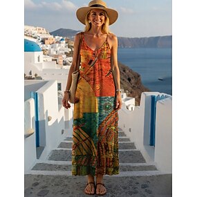 Damen Maxikleid Unterkleid Lässig Täglich Normale Passform Grafik Paisley-Muster Ärmellos V Ausschnitt Rote Orange Sommer Frühling