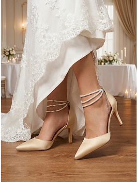 Satin-Pumps mit Schleife und Knöchelriemen für Damen – spitze Stiletto-Brautschuhe für formelle Hochzeiten