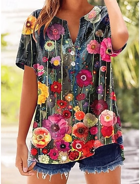 Damen T Shirt Druck Blumen Grafik Pflanzen Bohemien Hawaiianisch Stilvoll Kurzarm Rundhalsausschnitt Lange Oberteile Täglich Blau Schwarz Leicht Rosa Gelb Dunkelgrün Sommer Frühling