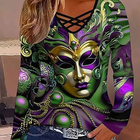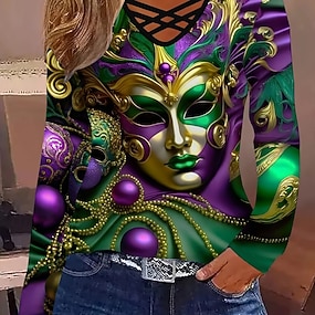 Karneval Damen T-Shirt Langarm Tee Grafik Lässig Langarm V-Ausschnitt Reguläre Oberteile Täglicher Cut Out Druck Lila Grün Frühling Herbst Vorsaison