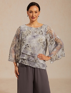 Frühlingsblüten-Bluse aus fließendem Chiffon mit asymmetrischen Dolman-Ärmeln