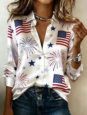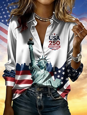 Damenbluse zum 250. Unabhängigkeitstag der USA, Satinbluse mit amerikanischer Flagge, Urlaubsmotiv, Langarmshirt mit Kragen, normale Oberteile, weiß, für Sommer, Frühling und Herbst