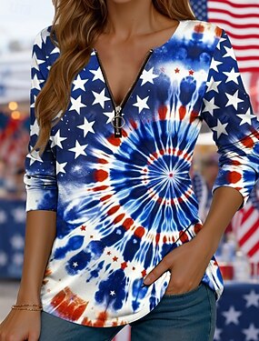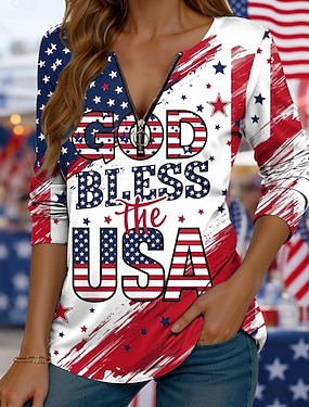 Amerikanischer Unabhängigkeitstag Damen Bluse Druck Flagge Lässig Kurzarm V Ausschnitt Normale Oberteile Täglich Marineblau Khaki Rot / Blau Leicht Blau Sommer Frühling