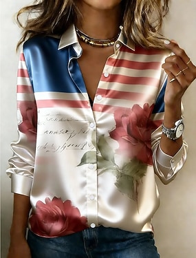 Amerikanischer Unabhängigkeitstag Damen Hemd Satinhemd Druck Blumen Grafik Flagge Bohemien Vintage Stilvoll Langarm Hemdkragen Normale Oberteile Täglich Ferien Ausgehen Blau Weiß Rote Sommer Frühling