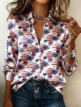 Unabhängigkeitstag Amerikanische Frauen T-Shirt Knöpfe Druck Grafik Amerikanisches Jubiläum Vintage Stylisch Modern Langarm Hemd Kragen Regulär Tops Täglich Weiß Sommer Frühling
