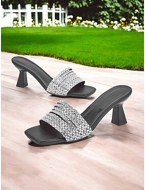 Damen-Sandalen mit Strasssteinen zum Hineinschlüpfen und Absatz – glitzernde Pantoletten mit quadratischer Spitze und Blockabsatz für Partys, Abendveranstaltungen und besondere Anlässe