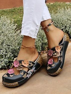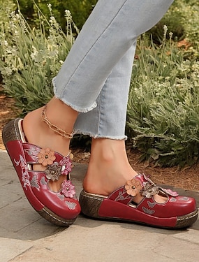 Damen-Slipper-Clogs aus lila geblümtem Leder mit 3D-Blumenapplikation – bequeme Vintage-Schuhe im Bohème-Stil für die Freizeit, Gartenarbeit und Reisen