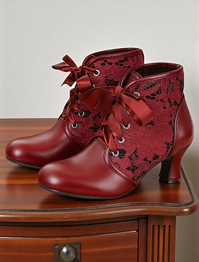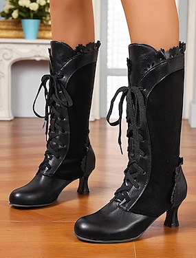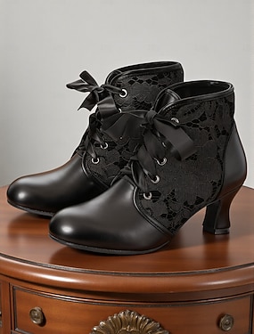 Damenstiefeletten im viktorianischen Stil mit Schnürung und Vintage-Brogue-Details – High Heels aus Kunstleder und Stoff für Retro-Mode